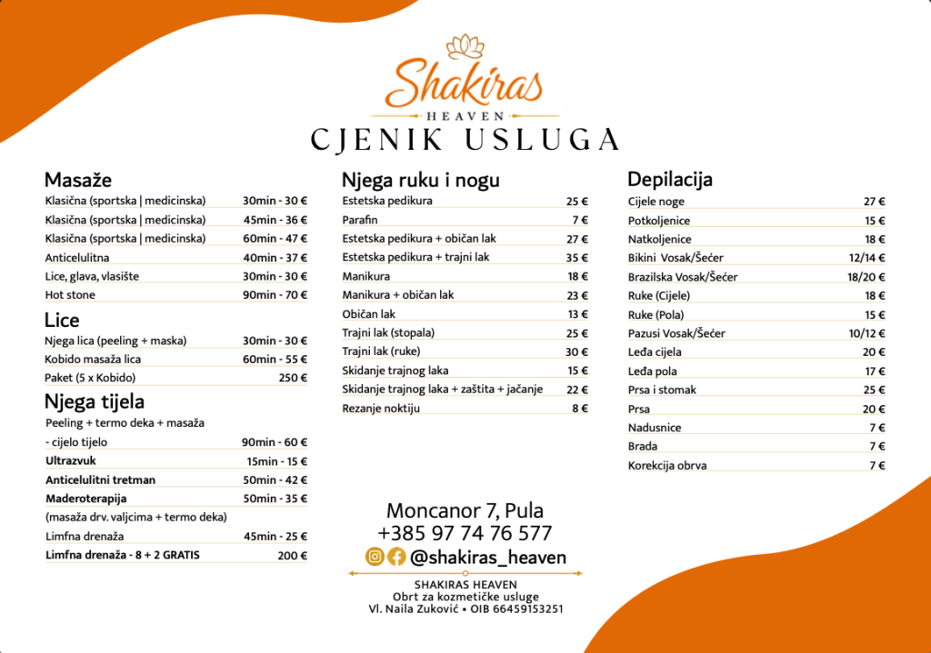 Salon Shakiras Heaven otvoren je 2017. godine s idejom da se stvori mjesto gdje će svatko moći pronaći svoju malu oazu mira i opuštanja. Ja sam Naila, kozmetičarka i maserka s više od 22 godine iskustva, a u svom radu posebnu pažnju posvećujem kvaliteti tretmana i svakom detalju koji doprinosi ugodnom iskustvu.